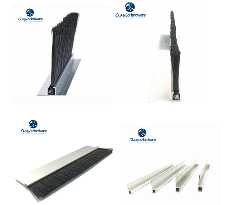 工業(yè)門(mén)、卷簾門(mén)、快速門(mén)一般使用H型(180°)或者F型(90°)鋁條配套毛刷,毛刷的高度常用規格是35mm,50mm,100mm,毛料有PP,PA。